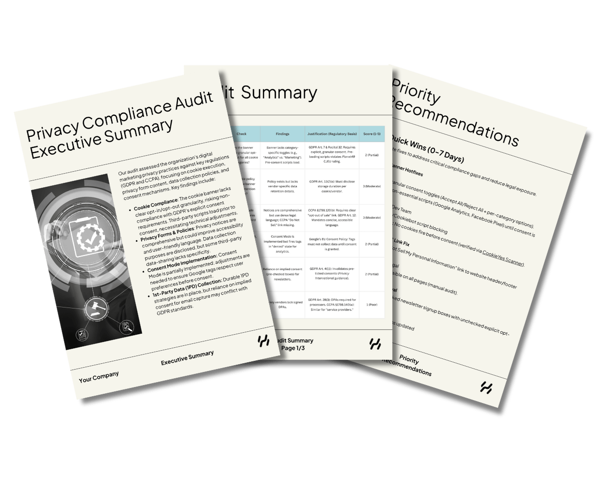 Risk Summary: Compliance status for cookies, tracking, and data collection Urgency Ranking: Critical vs. recommended fixes Technical Action Plan: How to adjust tags, scripts, and forms